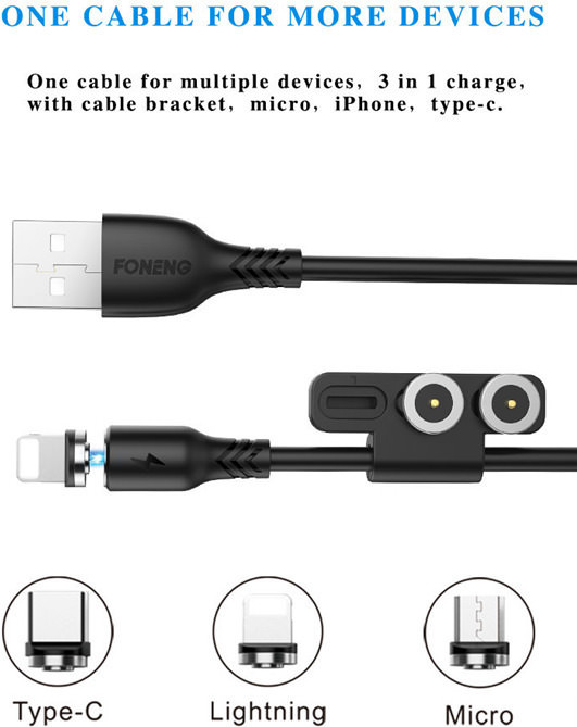 Μulti port καλώδιο μήκους 1m της εταιρείας Foneng. Τα μαγνητικά βύσματα σου δίνουν την επιλογή να τα αφήνεις πάνω στη συσκευή μειώνοντας τις φθορές της θύρας φόρτισης.